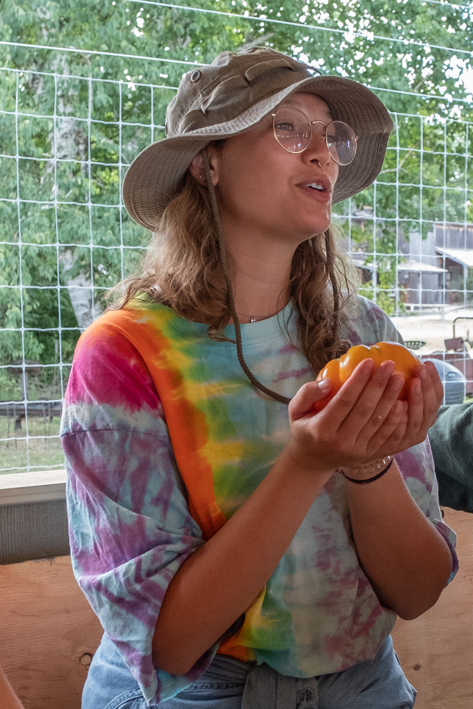 Slicing a “Kellogg Breakfast” tomato – one of several heirloom varieties harvested for a camp group gathered for a tasting in the farm Pavilion, Jess waxes ecstatic over her fresh produce. “This is my all-time favorite tomato,” she tells the campers. “Tasting it changed my life!”